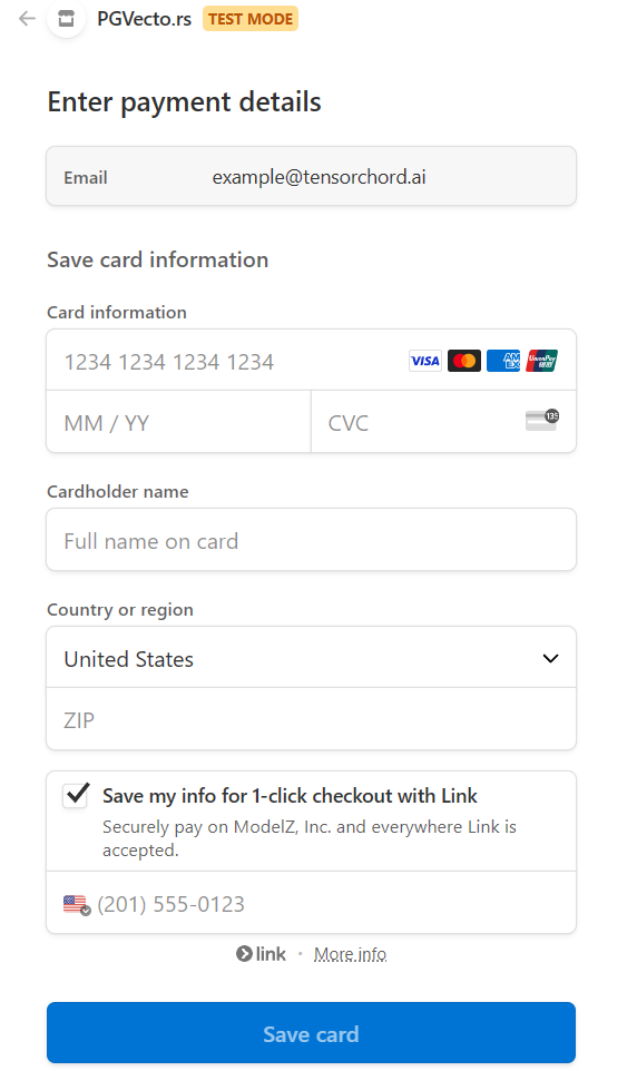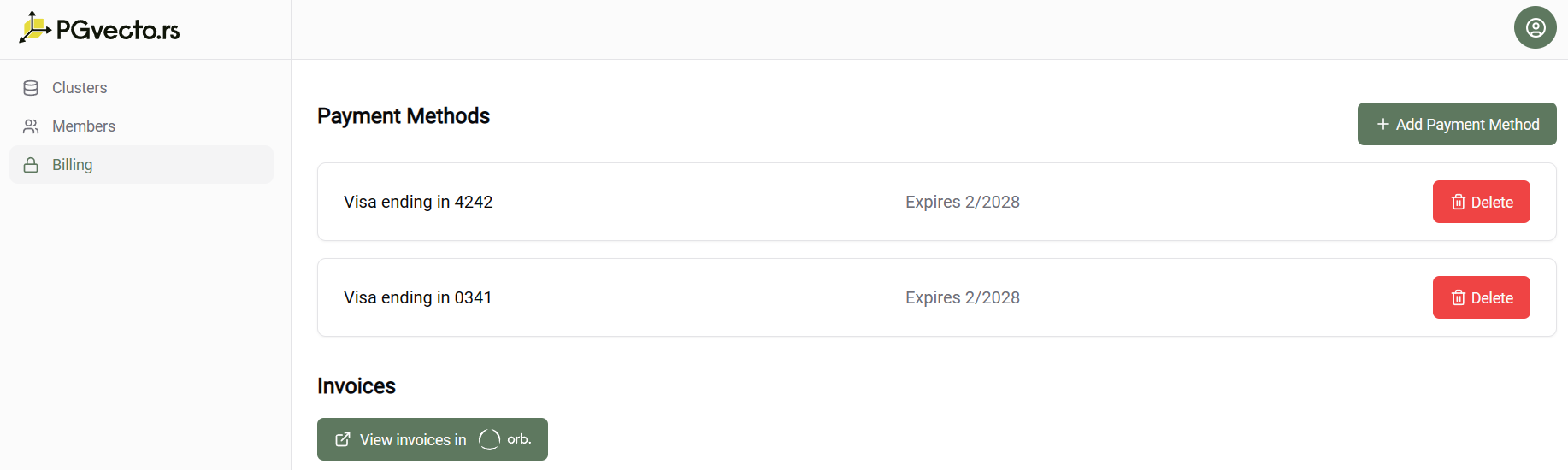 VectorChord Cloud supports credit card payments. You can add multiple credit cards or remove some of them by clicking Delete. Already added credit cards will be displayed on the billing page.